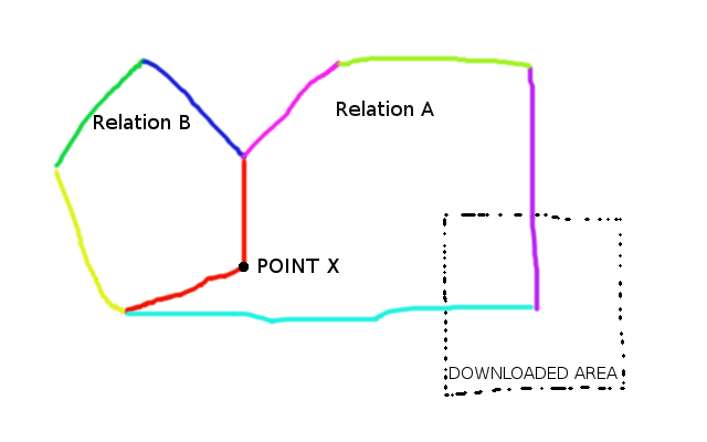 When a way is downloaded by the "download area" function, all related relations are downloaded too, so the flag will be set to true. When downloading additional members of a relation, this flag will be set to false. When executing an operation (on ways) which has impacts on relations, they should be rejected, if allRelationsDowloaded is not true. We need an additional function to download all relations of an object (node, way, or relation). This would be enough in the example to apply this function on the "red" way in the example before splitting this way.