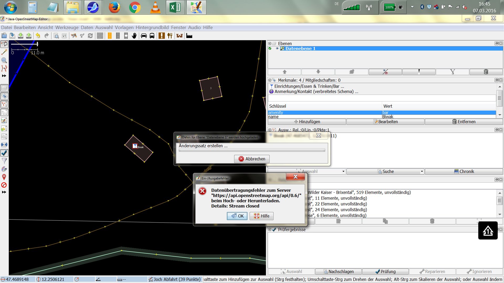 URL:http://josm.openstreetmap.de/svn/trunk Repository:UUID: 0c6e7542-c601-0410-84e7-c038aed88b3b Last:Changed Date: 2016-02-28 14:07:49 +0100 (Sun, 28 Feb 2016) Build-Date:2016-02-28 20:07:32 Revision:9900 Relative:URL: ^/trunk Identification: JOSM/1.5 (9900 de) Windows 7 64-Bit Memory Usage: 482 MB / 910 MB (267 MB allocated, but free) Java version: 1.8.0_73-b02, Oracle Corporation, Java HotSpot(TM) 64-Bit Server VM Dataset consistency test: No problems found Plugins: - OpeningHoursEditor (31772) - turnrestrictions (31895) Last errors/warnings: - E: org.openstreetmap.josm.io.OsmTransferException: java.io.IOException: Stream closed. Ursache: java.io.IOException: Stream closed - E: org.openstreetmap.josm.io.OsmTransferException: java.io.IOException: Stream closed. Ursache: java.io.IOException: Stream closed - E: org.openstreetmap.josm.io.OsmTransferException: java.io.IOException: Stream closed. Ursache: java.io.IOException: Stream closed - E: org.openstreetmap.josm.io.OsmTransferException: java.io.IOException: Stream closed. Ursache: java.io.IOException: Stream closed - W: 1 problems occured during upload/save