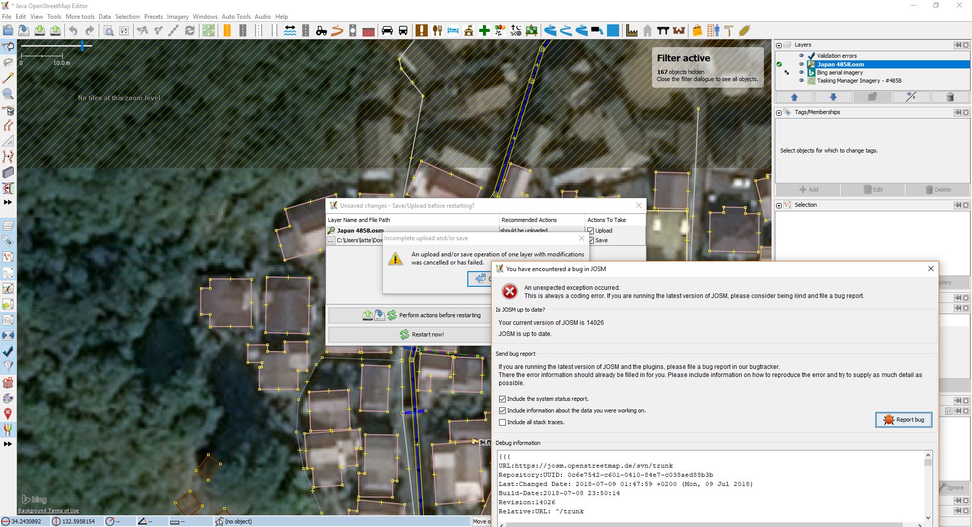 URL:https://josm.openstreetmap.de/svn/trunk Repository:UUID: 0c6e7542-c601-0410-84e7-c038aed88b3b Last:Changed Date: 2018-07-09 01:47:59 +0200 (Mon, 09 Jul 2018) Build-Date:2018-07-08 23:50:14 Revision:14026 Relative:URL: ^/trunk Identification: JOSM/1.5 (14026 en_AU) Windows 10 64-Bit OS Build number: Windows 10 Home 1709 (16299) Memory Usage: 431 MB / 1794 MB (194 MB allocated, but free) Java version: 1.8.0_171-b11, Oracle Corporation, Java HotSpot(TM) 64-Bit Server VM Screen: \Display0 1920x1080, \Display1 1920x1080 Maximum Screen Size: 1920x1080 Dataset consistency test: No problems found Plugins: + auto_tools (1529260859) + buildings_tools (34212) + changeset-viewer (15) + contourmerge (1033) + merge-overlap (34389) + terracer (34109) + undelete (34274) + utilsplugin2 (34389) Last errors/warnings: - E: org.openstreetmap.josm.io.OsmTransferCanceledException: Operation canceled - E: org.openstreetmap.josm.io.OsmTransferCanceledException: Operation canceled - E: org.openstreetmap.josm.io.OsmTransferCanceledException: Operation canceled - E: org.openstreetmap.josm.io.OsmTransferCanceledException: Operation canceled - E: org.openstreetmap.josm.io.OsmTransferCanceledException: Operation canceled - E: org.openstreetmap.josm.io.OsmTransferCanceledException: Operation canceled - E: org.openstreetmap.josm.io.OsmTransferCanceledException: Operation canceled - E: org.openstreetmap.josm.io.OsmTransferCanceledException: Operation canceled - E: Handled by bug report queue: org.openstreetmap.josm.io.OsmTransferCanceledException: Operation canceled - W: 1 problems occured during upload/save === REPORTED CRASH DATA === BugReportExceptionHandler#handleException: No data collected. Warning issued by: BugReportExceptionHandler#handleException === STACK TRACE === Thread: AWT-EventQueue-0 (19) of main org.openstreetmap.josm.io.OsmTransferCanceledException: Operation canceled at org.openstreetmap.josm.io.OsmApi.sleepAndListen(OsmApi.java:600) at org.openstreetmap.josm.io.OsmApi.sendRequest(OsmApi.java:698) at org.openstreetmap.josm.io.OsmApi.sendRequest(OsmApi.java:640) at org.openstreetmap.josm.io.OsmApi.uploadDiff(OsmApi.java:574) at org.openstreetmap.josm.io.OsmServerWriter.uploadChangesAsDiffUpload(OsmServerWriter.java:135) at org.openstreetmap.josm.io.OsmServerWriter.uploadOsm(OsmServerWriter.java:211) at org.openstreetmap.josm.gui.io.UploadLayerTask.run(UploadLayerTask.java:125) at java.util.concurrent.Executors$RunnableAdapter.call(Unknown Source) at java.util.concurrent.FutureTask.run(Unknown Source) at java.util.concurrent.ThreadPoolExecutor.runWorker(Unknown Source) at java.util.concurrent.ThreadPoolExecutor$Worker.run(Unknown Source) at java.lang.Thread.run(Unknown Source)