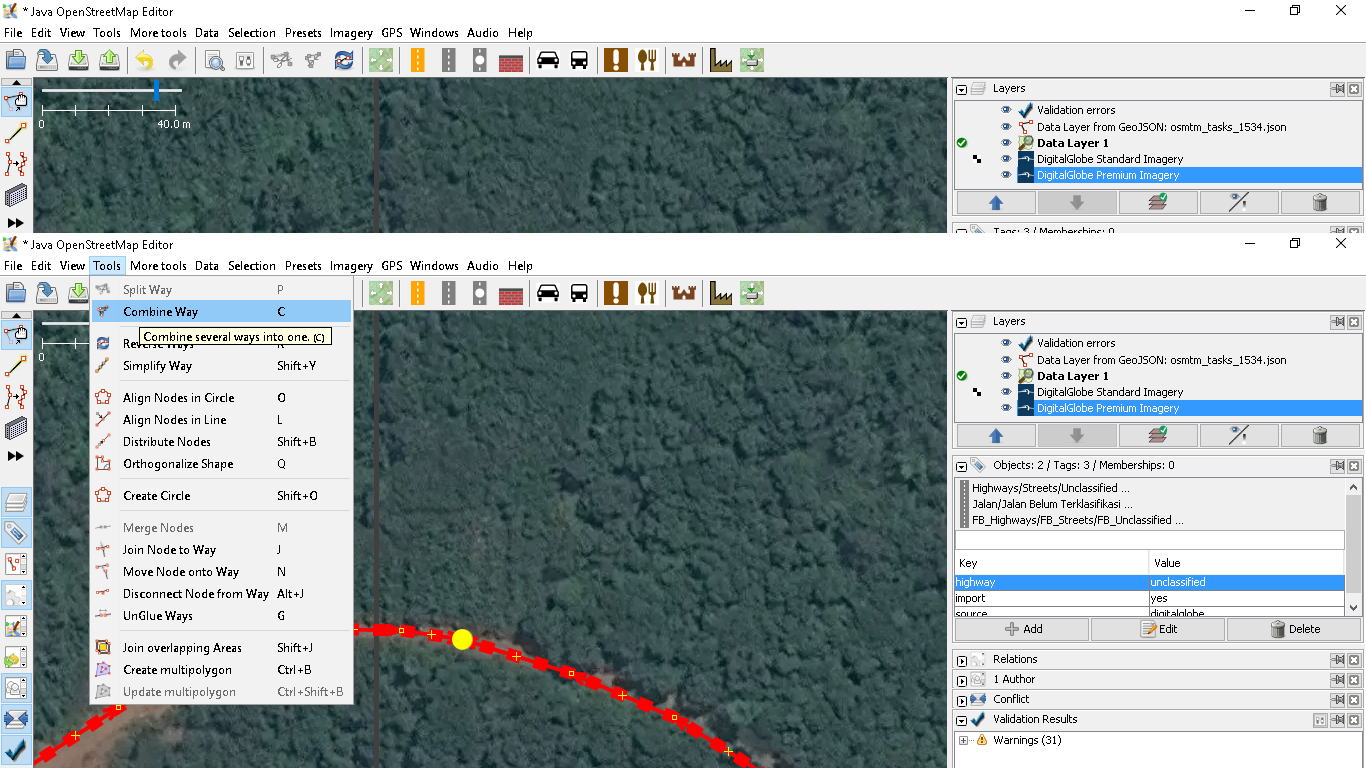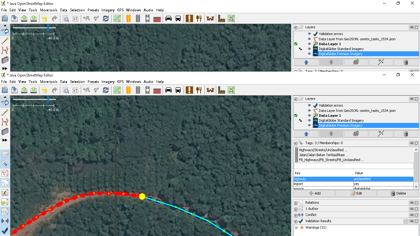 URL:https://josm.openstreetmap.de/svn/trunk Repository:UUID: 0c6e7542-c601-0410-84e7-c038aed88b3b Last:Changed Date: 2018-11-28 01:09:01 +0100 (Wed, 28 Nov 2018) Build-Date:2018-11-28 00:26:41 Revision:14460 Relative:URL: ^/trunk Identification: JOSM/1.5 (14460 en) Windows 10 64-Bit OS Build number: Windows 10 Pro 1511 (10586) Memory Usage: 845 MB / 989 MB (168 MB allocated, but free) Java version: 1.8.0_144-b01, Oracle Corporation, Java HotSpot(TM) Client VM Screen: \Display0 1366x768 Maximum Screen Size: 1366x768 Dataset consistency test: No problems found Plugins: + DirectUpload (34502) + apache-commons (34506) + buildings_tools (34724) + ejml (34389) + geojson (87) + geotools (34513) + imagery_offset_db (34641) + jaxb (34506) + jts (34524) + opendata (34698) + todo (30306) + turnrestrictions (34643) + utilsplugin2 (34506) Tagging presets: + F:\PROJECTS\HOT\WFP YOGYA\Pelatihan OSM Universitas Negeri Yogyakarta\02 Software\Preset\OSM_Indonesia_Presets_Ver.3.2.xml + F:\PROJECTS\HOT\FACEBOOK\FBS\FB_presets.xml Map paint styles: - F:\PROJECTS\HOT\FACEBOOK\FBS\FB_style.mapcss + F:\PROJECTS\HOT\FACEBOOK\FB\FB_style.mapcss Validator rules: + F:\PROJECTS\HOT\FACEBOOK\FBS\FB_rules_HOT.validator.mapcss Last errors/warnings: - W: Unable to convert property casing-color to type class java.awt.Color: found #0023b21 of type class java.lang.String! - W: Unable to convert property casing-color to type class java.awt.Color: found #0023b21 of type class java.lang.String! - W: Unable to convert property casing-color to type class java.awt.Color: found #0023b21 of type class java.lang.String! - W: Unable to convert property casing-color to type class java.awt.Color: found #0023b21 of type class java.lang.String! - W: Unable to convert property casing-color to type class java.awt.Color: found #0023b21 of type class java.lang.String! - W: Unable to convert property casing-color to type class java.awt.Color: found #0023b21 of type class java.lang.String! - W: Unable to convert property casing-color to type class java.awt.Color: found #0023b21 of type class java.lang.String! - W: Unable to convert property casing-color to type class java.awt.Color: found #0023b21 of type class java.lang.String! - W: java.net.SocketTimeoutException: Read timed out - W: java.net.SocketTimeoutException: Read timed out