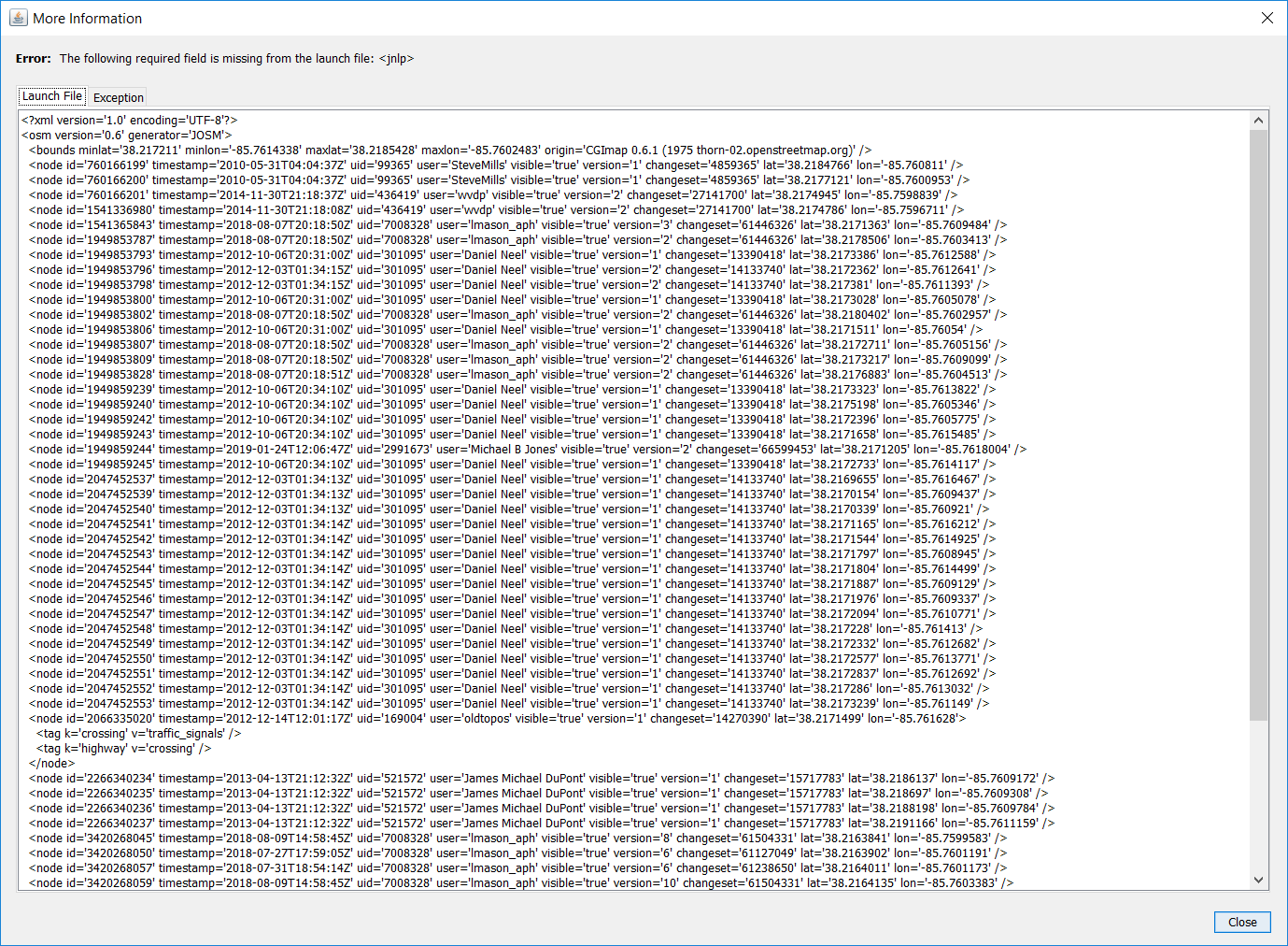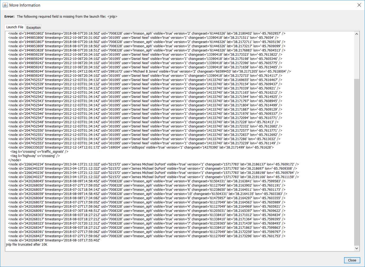 I apologize in advance for the formatting of this reply, I was unaware it would send the screen shots instead of my reply. When I double click to open previously saved JOSM files from either the folder where I save them—or the desktop, and/or using the context menu, I get the same pop-up. I have sent all the information from the pop-up. The 'Exception' Tab info, and 2 sceen shots of the 'Launch File' because it had to be scrolled. This happened with last months version, and the current 14760 version. I suspect it may be an issue with my computer, just not sure what to look for.