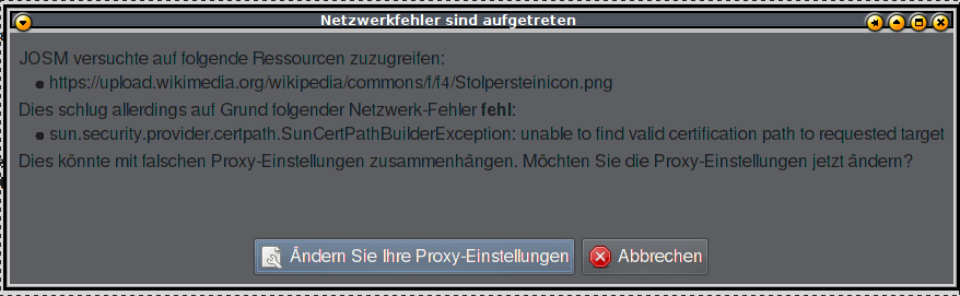 You got a requester after starting josm telling you to check your proxy-settings (which are fine) because it can´t download the file https://upload.wikimedia.org/wikipedia/commons/f/f4/Stolpersteinicon.png