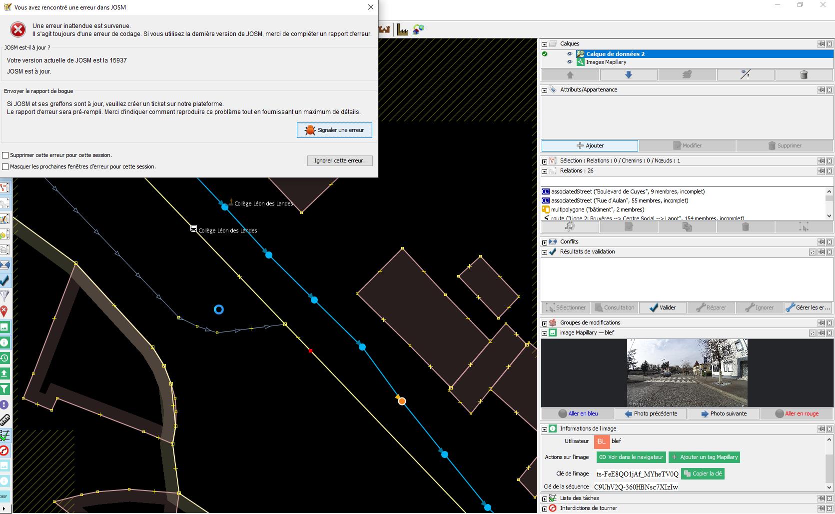 URL:https://josm.openstreetmap.de/svn/trunk Repository:UUID: 0c6e7542-c601-0410-84e7-c038aed88b3b Last:Changed Date: 2020-02-26 10:50:27 +0100 (Wed, 26 Feb 2020) Build-Date:2020-02-26 09:52:41 Revision:15937 Relative:URL: ^/trunk Identification: JOSM/1.5 (15937 fr) Windows 10 64-Bit OS Build number: Windows 10 Pro 1909 (18363) Memory Usage: 859 MB / 1820 MB (556 MB allocated, but free) Java version: 1.8.0_241-b07, Oracle Corporation, Java HotSpot(TM) 64-Bit Server VM Screen: \Display0 1680x1050 Maximum Screen Size: 1680x1050 Dataset consistency test: No problems found Plugins: + ColorPlugin (1537115529) + DirectDownload (35248) + Mapillary (1.5.20) + MicrosoftStreetside (35248) + apache-commons (35092) + apache-http (35092) + cadastre-fr (35332) + ejml (35122) + geotools (35169) + javafx-windows + jaxb (35092) + jna (35092) + jogl (1.2.3) + jts (35122) + kendzi3d-resources (0.0.2) + log4j (35092) + measurement (35248) + reverter (35313) + todo (30306) + tofix (490) + turnrestrictions (35313) + undelete (35313) + utilsplugin2 (35334) Map paint styles: + https://josm.openstreetmap.de/josmfile?page=Styles/MaxspeedIcons&zip=1 + https://josm.openstreetmap.de/josmfile?page=Styles/Maxspeed&zip=1 Last errors/warnings: - E: Handled by bug report queue: org.openstreetmap.josm.tools.JosmRuntimeException: java.lang.reflect.InvocationTargetException. Cause : java.lang.reflect.InvocationTargetException. Cause : java.lang.NullPointerException - E: Handled by bug report queue: org.openstreetmap.josm.tools.JosmRuntimeException: java.lang.reflect.InvocationTargetException. Cause : java.lang.reflect.InvocationTargetException. Cause : java.lang.NullPointerException - E: Handled by bug report queue: org.openstreetmap.josm.tools.JosmRuntimeException: java.lang.reflect.InvocationTargetException. Cause : java.lang.reflect.InvocationTargetException. Cause : java.lang.NullPointerException - W: Impossible de lire depuis l URL https://a.mapillary.com/v3/sequences?client_id=T1Fzd20xZjdtR0s1VDk5OFNIOXpYdzoxNDYyOGRkYzUyYTFiMzgz&bbox=-1.0592258%2C43.7053133%2C-1.0581529%2C43.7057787!: java.io.IOException: Server returned HTTP response code: 503 for URL: https://a.mapillary.com/v3/sequences?client_id=T1Fzd20xZjdtR0s1VDk5OFNIOXpYdzoxNDYyOGRkYzUyYTFiMzgz&bbox=-1.0592258%2C43.7053133%2C-1.0581529%2C43.7057787 - W: Impossible de lire depuis l URL https://a.mapillary.com/v3/sequences?client_id=T1Fzd20xZjdtR0s1VDk5OFNIOXpYdzoxNDYyOGRkYzUyYTFiMzgz&bbox=-1.0591078%2C43.7029089%2C-1.0542583%2C43.7054219!: java.io.IOException: Server returned HTTP response code: 503 for URL: https://a.mapillary.com/v3/sequences?client_id=T1Fzd20xZjdtR0s1VDk5OFNIOXpYdzoxNDYyOGRkYzUyYTFiMzgz&bbox=-1.0591078%2C43.7029089%2C-1.0542583%2C43.7054219 - W: Impossible de lire depuis l URL https://a.mapillary.com/v3/images?client_id=T1Fzd20xZjdtR0s1VDk5OFNIOXpYdzoxNDYyOGRkYzUyYTFiMzgz&bbox=-1.0592258%2C43.7053133%2C-1.0581529%2C43.7057787!: java.io.IOException: Server returned HTTP response code: 503 for URL: https://a.mapillary.com/v3/images?client_id=T1Fzd20xZjdtR0s1VDk5OFNIOXpYdzoxNDYyOGRkYzUyYTFiMzgz&bbox=-1.0592258%2C43.7053133%2C-1.0581529%2C43.7057787 - W: Impossible de lire depuis l URL https://a.mapillary.com/v3/image_detections?client_id=T1Fzd20xZjdtR0s1VDk5OFNIOXpYdzoxNDYyOGRkYzUyYTFiMzgz&bbox=-1.0591078%2C43.7029089%2C-1.0542583%2C43.7054219&layers=trafficsigns&sort_by=key!: java.io.IOException: Server returned HTTP response code: 503 for URL: https://a.mapillary.com/v3/image_detections?client_id=T1Fzd20xZjdtR0s1VDk5OFNIOXpYdzoxNDYyOGRkYzUyYTFiMzgz&bbox=-1.0591078%2C43.7029089%2C-1.0542583%2C43.7054219&layers=trafficsigns&sort_by=key - W: Impossible de lire depuis l URL https://a.mapillary.com/v3/image_detections?client_id=T1Fzd20xZjdtR0s1VDk5OFNIOXpYdzoxNDYyOGRkYzUyYTFiMzgz&bbox=-1.0592258%2C43.7053133%2C-1.0581529%2C43.7057787&layers=trafficsigns&sort_by=key!: java.io.IOException: Server returned HTTP response code: 503 for URL: https://a.mapillary.com/v3/image_detections?client_id=T1Fzd20xZjdtR0s1VDk5OFNIOXpYdzoxNDYyOGRkYzUyYTFiMzgz&bbox=-1.0592258%2C43.7053133%2C-1.0581529%2C43.7057787&layers=trafficsigns&sort_by=key - W: Impossible de lire depuis l URL https://a.mapillary.com/v3/images?client_id=T1Fzd20xZjdtR0s1VDk5OFNIOXpYdzoxNDYyOGRkYzUyYTFiMzgz&bbox=-1.0591078%2C43.7029089%2C-1.0542583%2C43.7054219!: java.io.IOException: Server returned HTTP response code: 503 for URL: https://a.mapillary.com/v3/images?client_id=T1Fzd20xZjdtR0s1VDk5OFNIOXpYdzoxNDYyOGRkYzUyYTFiMzgz&bbox=-1.0591078%2C43.7029089%2C-1.0542583%2C43.7054219 - E: Handled by bug report queue: org.openstreetmap.josm.tools.JosmRuntimeException: java.lang.reflect.InvocationTargetException. Cause : java.lang.reflect.InvocationTargetException. Cause : java.lang.NullPointerException === REPORTED CRASH DATA === BugReportExceptionHandler#handleException: No data collected. Warning issued by: BugReportExceptionHandler#handleException === STACK TRACE === Thread: AWT-EventQueue-0 (17) of main org.openstreetmap.josm.tools.JosmRuntimeException: java.lang.reflect.InvocationTargetException at org.openstreetmap.josm.gui.mappaint.mapcss.ConditionFactory$PseudoClassCondition.applies(ConditionFactory.java:847) at org.openstreetmap.josm.gui.mappaint.mapcss.Selector$AbstractSelector.matches(Selector.java:554) at org.openstreetmap.josm.gui.mappaint.mapcss.MapCSSStyleSource.apply(MapCSSStyleSource.java:704) at org.openstreetmap.josm.gui.mappaint.ElemStyles.generateStyles(ElemStyles.java:384) at org.openstreetmap.josm.tools.ImageProvider.getTaggedPadded(ImageProvider.java:1586) at org.openstreetmap.josm.tools.ImageProvider.getPadded(ImageProvider.java:1546) at org.openstreetmap.josm.gui.dialogs.properties.TagEditHelper$AbstractTagsDialog.findIcon(TagEditHelper.java:696) at org.openstreetmap.josm.gui.dialogs.properties.TagEditHelper$AddTagsDialog.buildRecentTagsPanel(TagEditHelper.java:966) at org.openstreetmap.josm.gui.dialogs.properties.TagEditHelper$AddTagsDialog.suggestRecentlyAddedTags(TagEditHelp