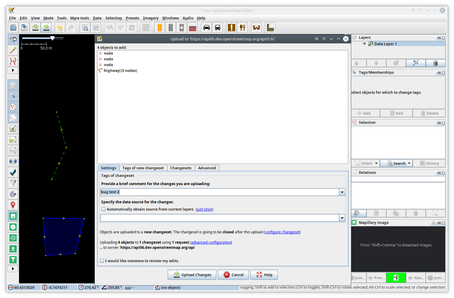 - Upload OSM data <-- upload dialog does not update list of object/s to add/modify/delete. Old objects of the first upload are shown there, the objects list is only updated, if I resize the upload dialog window.