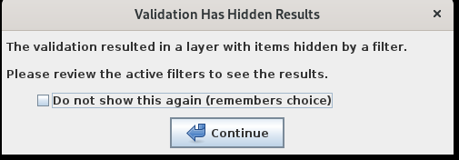 This enhancement is to warn the user when validation is performed while filters are actively hiding/disabling objects. The dialog allows the user to persist their response as the saved preference key 'validator.vallidate_with_filters_action' (values are 'ask' (default), 'continue', and 'fail').