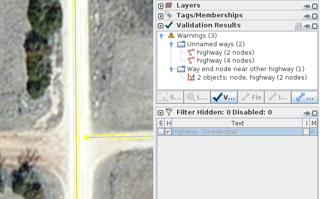 Validation done with the filter enabled, causing the 'way end node near other highway' result to not be identified.