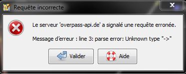 - E: Requête incorrecte - <html>Le serveur 'overpass-api.de' a signalé une requête erronée.<br><br>Message d’erreur : line 3: parse error: Unknown type "->" </html>