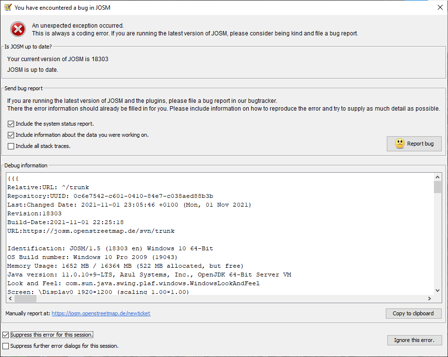Relative:URL: ^/trunk Repository:UUID: 0c6e7542-c601-0410-84e7-c038aed88b3b Last:Changed Date: 2021-11-01 23:05:46 +0100 (Mon, 01 Nov 2021) Revision:18303 Build-Date:2021-11-01 22:25:18 URL:https://josm.openstreetmap.de/svn/trunk Identification: JOSM/1.5 (18303 en) Windows 10 64-Bit OS Build number: Windows 10 Pro 2009 (19043) Memory Usage: 1652 MB / 16364 MB (300 MB allocated, but free) Java version: 11.0.10+9-LTS, Azul Systems, Inc., OpenJDK 64-Bit Server VM Look and Feel: com.sun.java.swing.plaf.windows.WindowsLookAndFeel Screen: \Display0 1920×1200 (scaling 1.00×1.00) Maximum Screen Size: 1920×1200 Best cursor sizes: 16×16→32×32, 32×32→32×32 System property file.encoding: Cp1252 System property sun.jnu.encoding: Cp1252 Locale info: en_US Numbers with default locale: 1234567890 -> 1234567890 VM arguments: [-Dicedtea-web.bin.location=E:\Program Files\OpenWebStart\javaws, -Djava.util.Arrays.useLegacyMergeSort=true, --add-exports=jdk.deploy/com.sun.deploy.config=ALL-UNNAMED, --add-opens=java.desktop/javax.swing.text.html=ALL-UNNAMED, --add-reads=java.naming=ALL-UNNAMED,java.desktop, --add-exports=java.base/sun.security.action=ALL-UNNAMED,java.desktop, --add-reads=java.base=ALL-UNNAMED,java.desktop, --add-exports=java.naming/com.sun.jndi.toolkit.url=ALL-UNNAMED,java.desktop, --add-opens=java.base/jdk.internal.loader=ALL-UNNAMED, --add-exports=java.desktop/com.apple.eawt=ALL-UNNAMED, --add-exports=java.desktop/sun.awt=ALL-UNNAMED,java.desktop, --add-opens=java.base/jdk.internal.ref=ALL-UNNAMED, --add-exports=java.base/sun.security.validator=ALL-UNNAMED,java.desktop, --add-exports=java.desktop/com.sun.imageio.plugins.jpeg=ALL-UNNAMED, --add-exports=java.base/sun.net.www.protocol.jar=ALL-UNNAMED,java.desktop, --add-exports=java.base/jdk.internal.util.jar=ALL-UNNAMED,java.desktop, --add-opens=java.prefs/java.util.prefs=ALL-UNNAMED, --add-exports=java.base/com.sun.net.ssl.internal.ssl=ALL-UNNAMED,java.desktop, --add-exports=javafx.graphics/com.sun.javafx.application=ALL-UNNAMED, --add-modules=java.scripting,java.sql,javafx.controls,javafx.media,javafx.swing,javafx.web, --add-exports=java.desktop/sun.awt.X11=ALL-UNNAMED,java.desktop, --add-exports=java.desktop/sun.applet=ALL-UNNAMED,java.desktop,jdk.jsobject, --add-exports=java.base/sun.net.www.protocol.http=ALL-UNNAMED,java.desktop, --add-opens=java.base/java.lang=ALL-UNNAMED, --add-exports=java.base/sun.security.util=ALL-UNNAMED,java.desktop, --add-exports=java.desktop/com.sun.imageio.spi=ALL-UNNAMED, --add-reads=java.desktop=ALL-UNNAMED,java.naming, --add-opens=java.base/java.nio=ALL-UNNAMED, --add-exports=java.base/sun.security.x509=ALL-UNNAMED,java.desktop, --add-opens=java.desktop/javax.imageio.spi=ALL-UNNAMED, --add-exports=java.desktop/javax.jnlp=ALL-UNNAMED,java.desktop, --add-exports=java.base/sun.security.provider=ALL-UNNAMED,java.desktop] Plugins: + BuildingGeneralization (36) + DirectDownload (35640) + DirectUpload (35858) + ImproveWay (32) + MakeParallel (v1.1.0) + RelationDissolve (0.2.0) + ShapeTools (1250) + Tracer2 (35640) + alignways (35753) + buildings_tools (35823) + centernode (v1.0.4) + continuosDownload (99) + contourmerge (v0.1.8) + easypresets (1623509627) + gridify (1606242219) + imagery_offset_db (35640) + measurement (35640) + terracer (35827) + utilsplugin2 (35856) Tagging presets: + <josm.pref>/EasyPresets.xml Map paint styles: + https://github.com/osmlab/applepaintstyles/archive/main.zip Last errors/warnings: - 96581.358 E: Handled by bug report queue: java.lang.IllegalArgumentException: Listener org.openstreetmap.josm.plugins.improveway.ImproveWayAccuracyAction@536aa9f5 (instance of org.openstreetmap.josm.plugins.improveway.ImproveWayAccuracyAction) was not registered before or already removed. - 96586.762 E: Handled by bug report queue: java.lang.IllegalArgumentException: Listener org.openstreetmap.josm.plugins.improveway.ImproveWayAccuracyAction@536aa9f5 (instance of org.openstreetmap.josm.plugins.improveway.ImproveWayAccuracyAction) was not registered before or already removed. - 96594.678 E: Handled by bug report queue: java.lang.IllegalArgumentException: Listener org.openstreetmap.josm.plugins.improveway.ImproveWayAccuracyAction@536aa9f5 (instance of org.openstreetmap.josm.plugins.improveway.ImproveWayAccuracyAction) was not registered before or already removed. - 96605.699 E: Handled by bug report queue: java.lang.IllegalArgumentException: Listener org.openstreetmap.josm.plugins.improveway.ImproveWayAccuracyAction@536aa9f5 (instance of org.openstreetmap.josm.plugins.improveway.ImproveWayAccuracyAction) was not registered before or already removed. - 96610.706 E: Handled by bug report queue: java.lang.IllegalArgumentException: Listener org.openstreetmap.josm.plugins.improveway.ImproveWayAccuracyAction@536aa9f5 (instance of org.openstreetmap.josm.plugins.improveway.ImproveWayAccuracyAction) was not registered before or already removed. - 96614.992 E: Handled by bug report queue: java.lang.IllegalArgumentException: Listener org.openstreetmap.josm.plugins.improveway.ImproveWayAccuracyAction@536aa9f5 (instance of org.openstreetmap.josm.plugins.improveway.ImproveWayAccuracyAction) was not registered before or already removed. - 596730.294 E: Handled by bug report queue: java.util.concurrent.RejectedExecutionException: Task java.util.concurrent.FutureTask@f0e13d2[Not completed, task = java.util.concurrent.Executors$RunnableAdapter@6594c271[Wrapped task = org.openstreetmap.josm.actions.OpenFileAction$OpenFileTask@732d7b3f]] rejected from org.openstreetmap.josm.gui.progress.swing.ProgressMonitorExecutor@42d74907[Terminated, pool size = 0, active threads = 0, queued tasks = 0, completed tasks = 51] - 596921.599 E: Handled by bug report queue: java.util.concurrent.RejectedExecutionException: Task java.util.concurrent.FutureTask@6a5fba86[Not completed, task = java.util.concurrent.Executors$RunnableAdapter@68b3ade6[Wrapped task = org.openstreetmap.josm.actions.OpenFileAction$OpenFileTask@145a1c13]] rejected 
