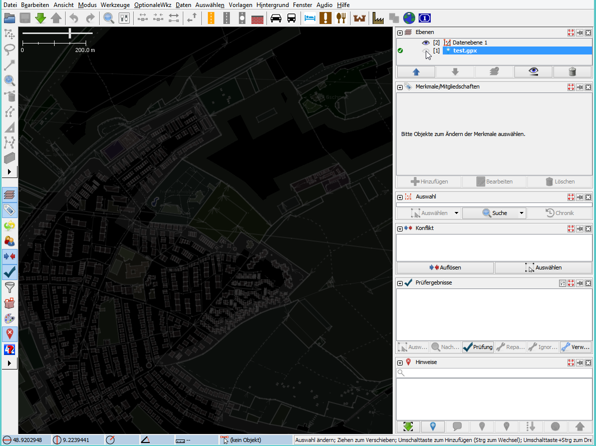 The OSM ways are grey and not editable. Deactiviating the GPX layer via the eye symbol does NOT help, the GPX track vanishes but the OSM ways are still grey and not editable. After deleting the GPX layer via the trash symbol the OSM ways immediately get their colours back and the ways are editable again.