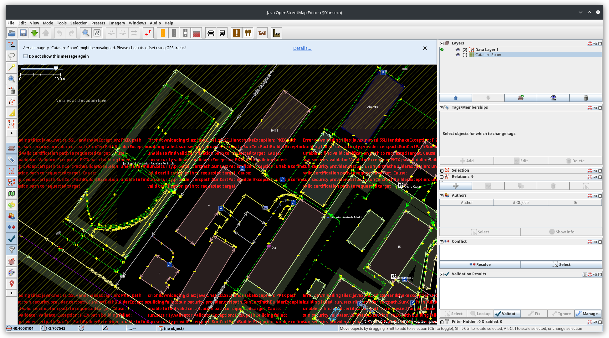 Relative:URL: ^/trunk Repository:UUID: 0c6e7542-c601-0410-84e7-c038aed88b3b Last:Changed Date: 2022-04-04 22:26:00 +0200 (Mon, 04 Apr 2022) Revision:18427 Build-Date:2022-04-05 01:30:55 URL:https://josm.openstreetmap.de/svn/trunk Identification: JOSM/1.5 (18427 es) Linux Arch Linux Memory Usage: 230 MB / 4004 MB (49 MB allocated, but free) Java version: 18.0.1+10, N/A, OpenJDK 64-Bit Server VM Look and Feel: javax.swing.plaf.metal.MetalLookAndFeel Screen: :0.0 1920×1080 (scaling 1.00×1.00) :0.1 1080×1920 (scaling 1.00×1.00) Maximum Screen Size: 1920×1920 Best cursor sizes: 16×16→16×16, 32×32→32×32 Environment variable LANG: es_ES.UTF-8 System property file.encoding: UTF-8 System property sun.jnu.encoding: UTF-8 Locale info: es_ES Numbers with default locale: 1234567890 -> 1234567890 Desktop environment: GNOME Dataset consistency test: No problems found Last errors/warnings: - 00150.370 W: javax.net.ssl.SSLHandshakeException: PKIX path building failed: sun.security.provider.certpath.SunCertPathBuilderException: unable to find valid certification path to requested target. Causa: sun.security.validator.ValidatorException: PKIX path building failed: sun.security.provider.certpath.SunCertPathBuilderException: unable to find valid certification path to requested target. Causa: sun.security.provider.certpath.SunCertPathBuilderException: unable to find valid certification path to requested target - 00150.370 W: Already here sun.security.provider.certpath.SunCertPathBuilderException: unable to find valid certification path to requested target - 00150.372 W: javax.net.ssl.SSLHandshakeException: PKIX path building failed: sun.security.provider.certpath.SunCertPathBuilderException: unable to find valid certification path to requested target. Causa: sun.security.validator.ValidatorException: PKIX path building failed: sun.security.provider.certpath.SunCertPathBuilderException: unable to find valid certification path to requested target. Causa: sun.security.provider.certpath.SunCertPathBuilderException: unable to find valid certification path to requested target - 00150.372 W: Already here sun.security.provider.certpath.SunCertPathBuilderException: unable to find valid certification path to requested target - 00379.594 W: javax.net.ssl.SSLHandshakeException: PKIX path building failed: sun.security.provider.certpath.SunCertPathBuilderException: unable to find valid certification path to requested target. Causa: sun.security.validator.ValidatorException: PKIX path building failed: sun.security.provider.certpath.SunCertPathBuilderException: unable to find valid certification path to requested target. Causa: sun.security.provider.certpath.SunCertPathBuilderException: unable to find valid certification path to requested target - 00379.594 W: javax.net.ssl.SSLHandshakeException: PKIX path building failed: sun.security.provider.certpath.SunCertPathBuilderException: unable to find valid certification path to requested target. Causa: sun.security.validator.ValidatorException: PKIX path building failed: sun.security.provider.certpath.SunCertPathBuilderException: unable to find valid certification path to requested target. Causa: sun.security.provider.certpath.SunCertPathBuilderException: unable to find valid certification path to requested target - 00379.594 W: javax.net.ssl.SSLHandshakeException: PKIX path building failed: sun.security.provider.certpath.SunCertPathBuilderException: unable to find valid certification path to requested target. Causa: sun.security.validator.ValidatorException: PKIX path building failed: sun.security.provider.certpath.SunCertPathBuilderException: unable to find valid certification path to requested target. Causa: sun.security.provider.certpath.SunCertPathBuilderException: unable to find valid certification path to requested target - 00379.613 W: javax.net.ssl.SSLHandshakeException: PKIX path building failed: sun.security.provider.certpath.SunCertPathBuilderException: unable to find valid certification path to requested target. Causa: sun.security.validator.ValidatorException: PKIX path building failed: sun.security.provider.certpath.SunCertPathBuilderException: unable to find valid certification path to requested target. Causa: sun.security.provider.certpath.SunCertPathBuilderException: unable to find valid certification path to requested target - 00379.615 W: javax.net.ssl.SSLHandshakeException: PKIX path building failed: sun.security.provider.certpath.SunCertPathBuilderException: unable to find valid certification path to requested target. Causa: sun.security.validator.ValidatorException: PKIX path building failed: sun.security.provider.certpath.SunCertPathBuilderException: unable to find valid certification path to requested target. Causa: sun.security.provider.certpath.SunCertPathBuilderException: unable to find valid certification path to requested target - 00379.615 W: javax.net.ssl.SSLHandshakeException: PKIX path building failed: sun.security.provider.certpath.SunCertPathBuilderException: unable to find valid certification path to requested target. Causa: sun.security.validator.ValidatorException: PKIX path building failed: sun.security.provider.certpath.SunCertPathBuilderException: unable to find valid certification path to requested target. Causa: sun.security.provider.certpath.SunCertPathBuilderException: unable to find valid certification path to requested target