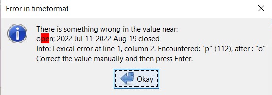 the following value (used to indicate a non-recurring temporal closure) is parsed correctly (as intended) by the opening_hours evaluation tool, but in the plugin it gives an "Error in timeformat"