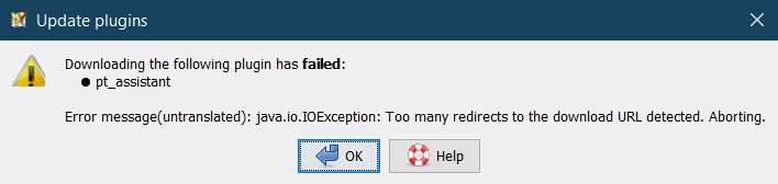 2023-03-16 18:16:55.933 SEVERE: org.openstreetmap.josm.plugins.PluginDownloadException: java.io.IOException: Too many redirects to the download URL detected. Aborting.. Cause: java.io.IOException: Too many redirects to the download URL detected. Aborting. org.openstreetmap.josm.plugins.PluginDownloadException: java.io.IOException: Too many redirects to the download URL detected. Aborting. at org.openstreetmap.josm.plugins.PluginDownloadTask.download(PluginDownloadTask.java:147) at org.openstreetmap.josm.plugins.PluginDownloadTask.realRun(PluginDownloadTask.java:175) at org.openstreetmap.josm.gui.PleaseWaitRunnable.doRealRun(PleaseWaitRunnable.java:94) at org.openstreetmap.josm.gui.PleaseWaitRunnable.run(PleaseWaitRunnable.java:142) at java.util.concurrent.Executors$RunnableAdapter.call(Unknown Source) at java.util.concurrent.FutureTask.run(Unknown Source) at java.util.concurrent.ThreadPoolExecutor.runWorker(Unknown Source) at java.util.concurrent.ThreadPoolExecutor$Worker.run(Unknown Source) at java.lang.Thread.run(Unknown Source) Caused by: java.io.IOException: Too many redirects to the download URL detected. Aborting. at org.openstreetmap.josm.tools.HttpClient.connect(HttpClient.java:197) at org.openstreetmap.josm.tools.HttpClient.connect(HttpClient.java:124) at org.openstreetmap.josm.plugins.PluginDownloadTask.download(PluginDownloadTask.java:128) ... 8 more 2023-03-16 18:16:55.945 WARNING: Update plugins - <html>Downloading the following plugin has <strong>failed</strong>:<ul><li>pt_assistant</li></ul><br>Error message(untranslated): java.io.IOException: Too many redirects to the download URL detected. Aborting.</html>
