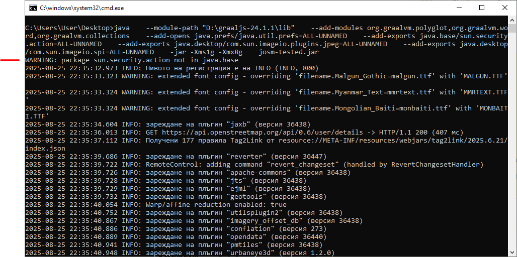 Relative:URL: ^/trunk Repository:UUID: 0c6e7542-c601-0410-84e7-c038aed88b3b Last:Changed Date: 2025-07-11 10:12:51 +0200 (Fri, 11 Jul 2025) Revision:19423 Build-Date:2025-07-12 01:30:35 URL:https://josm.openstreetmap.de/svn/trunk Identification: JOSM/1.5 (19423 bg) Windows 10 64-Bit OS Build number: Windows 10 Education 22H2 (19045) Memory Usage: 1024 MB / 8192 MB (619 MB allocated, but free) Java version: 24.0.2+11-jvmci-b01, GraalVM Community, OpenJDK 64-Bit Server VM Look and Feel: com.sun.java.swing.plaf.windows.WindowsLookAndFeel Screen: \Display0 1920x1080x32bpp@59Hz (scaling 1.00×1.00) Maximum Screen Size: 1920×1080 Best cursor sizes: 16×16→32×32, 32×32→32×32 System property file.encoding: UTF-8 System property sun.jnu.encoding: Cp1251 Locale info: bg_BG Numbers with default locale: 1234567890 -> 1234567890 VM arguments: [-XX:ThreadPriorityPolicy=1, --module-path=D:\graaljs-24.1.1\lib, --add-modules=org.graalvm.polyglot,org.graalvm.word,org.graalvm.collections, --add-opens=java.prefs/java.util.prefs=ALL-UNNAMED, --add-exports=java.base/sun.security.action=ALL-UNNAMED, --add-exports=java.desktop/com.sun.imageio.plugins.jpeg=ALL-UNNAMED, --add-exports=java.desktop/com.sun.imageio.spi=ALL-UNNAMED] Plugins: + Mapillary (1813) + apache-commons (36438) + conflation (273) + ejml (36438) + geotools (36438) + imagery_offset_db (36438) + jackson (36438) + jaxb (36438) + jts (36438) + opendata (36440) + pmtiles (36438) + reverter (36447) + scripting (v0.3.5) + splinex (36438) + urbaneye3d (1.2.0) + utilsplugin2 (36438) Tagging presets: + https://josm.openstreetmap.de/josmfile?page=Presets/NewParkingFeatures&zip=1 Map paint styles: - https://josm.openstreetmap.de/josmfile?page=Styles/Lane_and_Road_Attributes&zip=1 - https://josm.openstreetmap.de/josmfile?page=Styles/ParkingLanes&zip=1 - https://josm.openstreetmap.de/josmfile?page=Styles/MapWithAI&zip=1 Last errors/warnings: - 00000.448 W: extended font config - overriding 'filename.Malgun_Gothic=malgun.ttf' with 'MALGUN.TTF' - 00000.449 W: extended font config - overriding 'filename.Myanmar_Text=mmrtext.ttf' with 'MMRTEXT.TTF' - 00000.449 W: extended font config - overriding 'filename.Mongolian_Baiti=monbaiti.ttf' with 'MONBAITI.TTF'