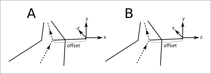 In OpenGl and inside kendzi3d it is used right handed coordinate system. So for me is obvious that function translate should behave as in picture "B". To be clear currently that function don't behave correctly and is not even similar to any of images.