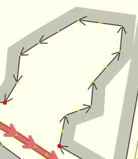 A new closed way between the 2 selected points will be created and the type of the area can be selected/entered for the new way. The way will be created from the 1st selected node in forward direction of the existing way to the 2nd selected node. This only works if the points are on the same way. To specify the way to use also select the way.
